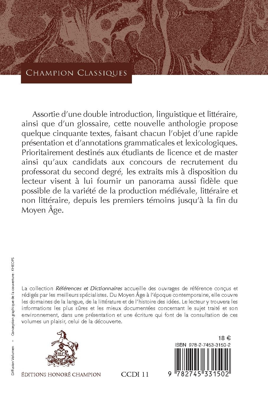 Assortie d’une double introduction, linguistique et littéraire, ainsi que d’un glossaire, cette nouvelle anthologie propose quelque cinquante textes, faisant chacun l’objet d’une rapide présentation et d’annotations grammaticales et lexicologiques. Prioritairement destinés aux étudiants de licence et de master ainsi qu’aux candidats aux concours de recrutement du professorat du second degré, les extraits mis à disposition du lecteur visent à lui fournir un panorama aussi fidèle que possible de la variété de la production médiévale, littéraire et non littéraire, depuis les premiers témoins jusqu’à la fin du Moyen Âge.