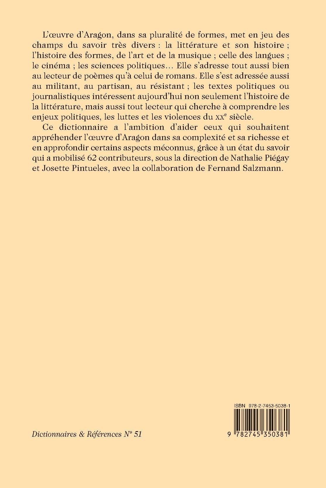 Ce dictionnaire a l’ambition d’aider ceux qui souhaitent appréhender l’oeuvre d’Aragon dans sa complexité et sa richesse et en approfondir certains aspects méconnus, grâce à un état du savoir qui a mobilisé 62 contributeurs, sous la direction de Nathalie Piégay et Josette Pintueles, avec la collaboration de Fernand Salzmann.
