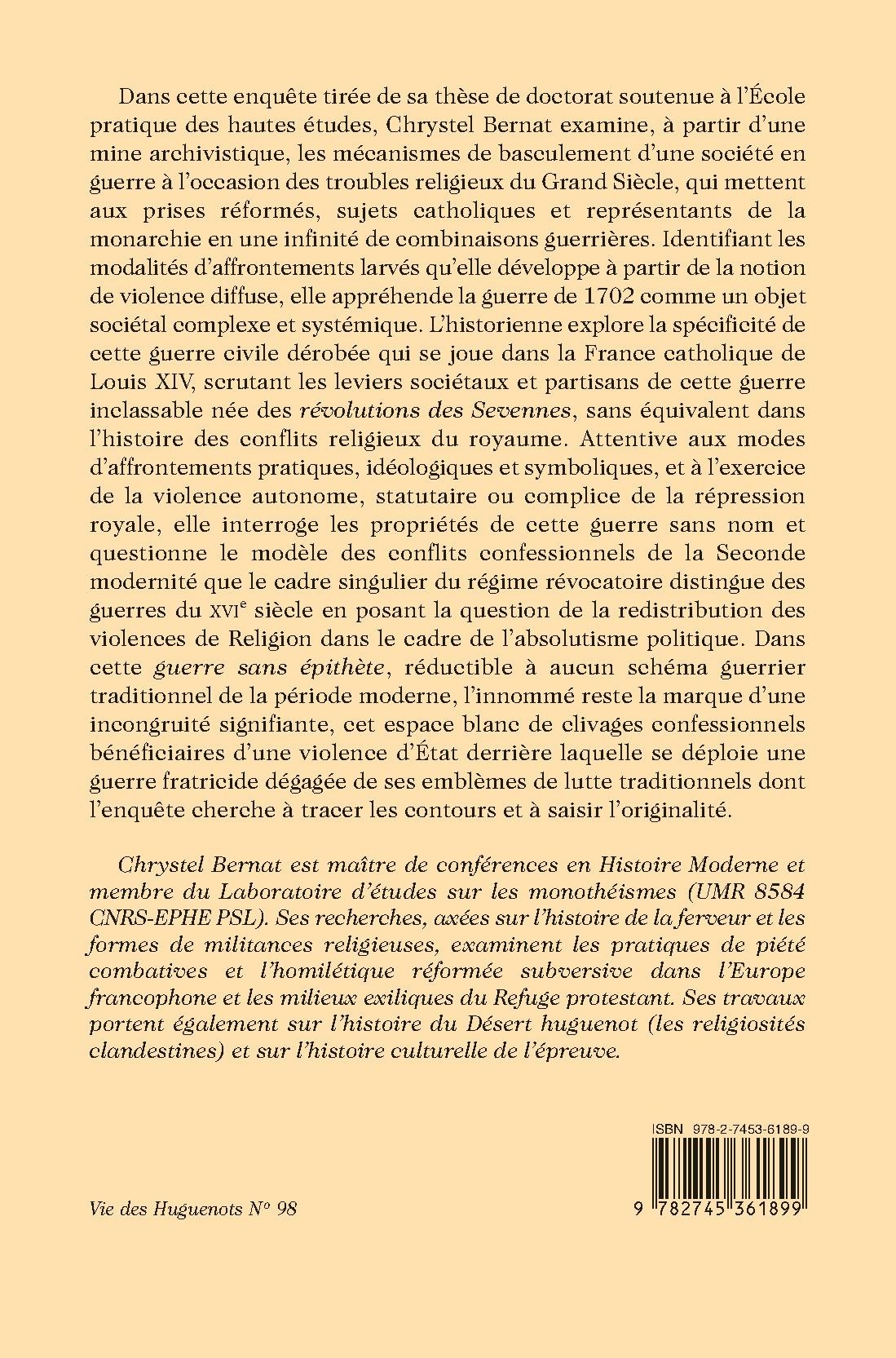 Dans cette enquête tirée de sa thèse de doctorat soutenue à l’École pratique des hautes études, Chrystel Bernat examine, à partir d’une mine archivistique, les mécanismes de basculement d’une société en guerre à l’occasion des troubles religieux du Grand Siècle, qui mettent aux prises réformés, sujets catholiques et représentants de la monarchie en une infinité de combinaisons guerrières. Identifiant les modalités d’affrontements larvés qu’elle développe à partir de la notion de violence diffuse, elle appréhende la guerre de 1702 comme un objet sociétal complexe et systémique. L’historienne explore la spécificité de cette guerre civile dérobée qui se joue dans la France catholique de Louis XIV, scrutant les leviers sociétaux et partisans de cette guerre inclassable née des révolutions des Sevennes, sans équivalent dans l’histoire des conflits religieux du royaume. Attentive aux modes d’affrontements pratiques, idéologiques et symboliques, et à l’exercice de la violence autonome, statutaire ou complice de la répression royale, elle interroge les propriétés de cette guerre sans nom et questionne le modèle des conflits confessionnels de la Seconde modernité que le cadre singulier du régime révocatoire distingue des guerres du XVIe siècle en posant la question de la redistribution des violences de Religion dans le cadre de l’absolutisme politique. Dans cette guerre sans épithète, réductible à aucun schéma guerrier traditionnel de la période moderne, l’innommé reste la marque d’une incongruité signifiante, cet espace blanc de clivages confessionnels bénéficiaires d’une violence d’État derrière laquelle se déploie une guerre fratricide dégagée de ses emblèmes de lutte traditionnels dont l’enquête cherche à tracer les contours et à saisir l’originalité.