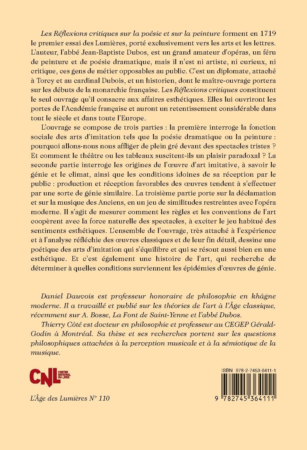 Les Réflexions critiques sur la poésie et sur la peinture forment en 1719 le premier essai des Lumières, porté exclusivement vers les arts et les lettres. L’auteur, l’abbé Jean-Baptiste Dubos, est un grand amateur d’opéras, un féru de peinture et de poésie dramatique, mais il n’est ni artiste, ni curieux, ni critique, ces gens de métier opposables au public. C’est un diplomate, attaché à Torcy et au cardinal Dubois, et un historien, dont le maître-ouvrage portera sur les débuts de la monarchie française. Les Réflexions critiques constituent le seul ouvrage qu’il consacre aux affaires esthétiques. Elles lui ouvriront les portes de l’Académie française et auront un retentissement considérable dans tout le siècle et dans toute l’Europe.