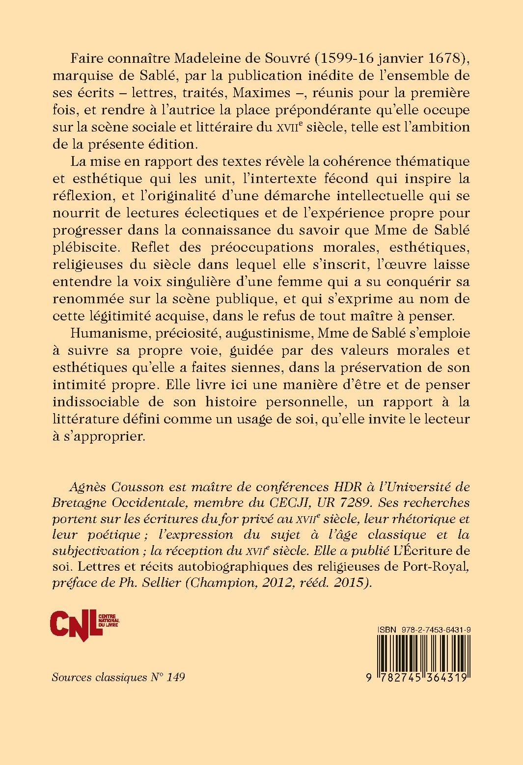 Humanisme, préciosité, augustinisme, Mme de Sablé s’emploie à suivre sa propre voie, guidée par des valeurs morales et esthétiques qu’elle a faites siennes, dans la préservation de son intimité propre. Elle livre ici une manière d’être et de penser indissociable de son histoire personnelle, un rapport à la littérature défini comme un usage de soi, qu’elle invite le lecteur à s’approprier.