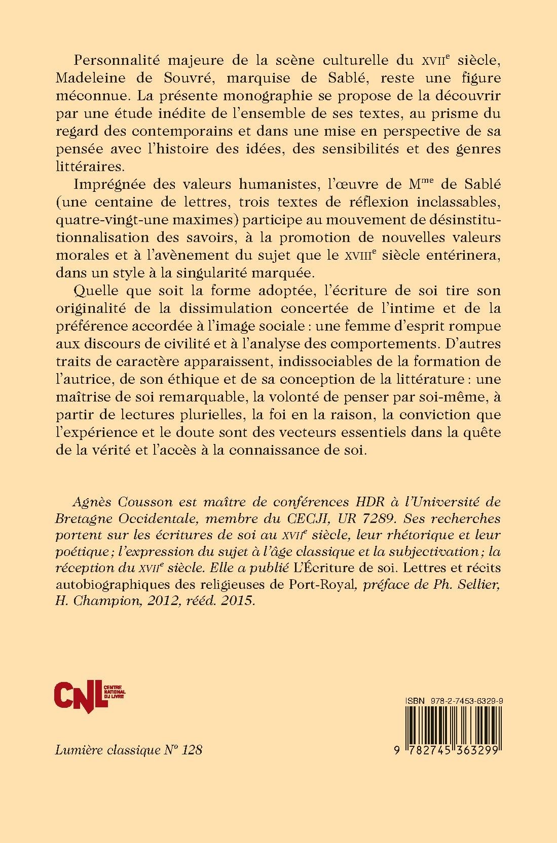 Personnalité majeure de la scène culturelle du XVIIe siècle, Madeleine de Souvré, marquise de Sablé, reste une figure méconnue. La présente monographie se propose de la découvrir par une étude inédite de l’ensemble de ses textes, au prisme du regard des contemporains et dans une mise en perspective de sa pensée avec l’histoire des idées, des sensibilités et des genres littéraires.
