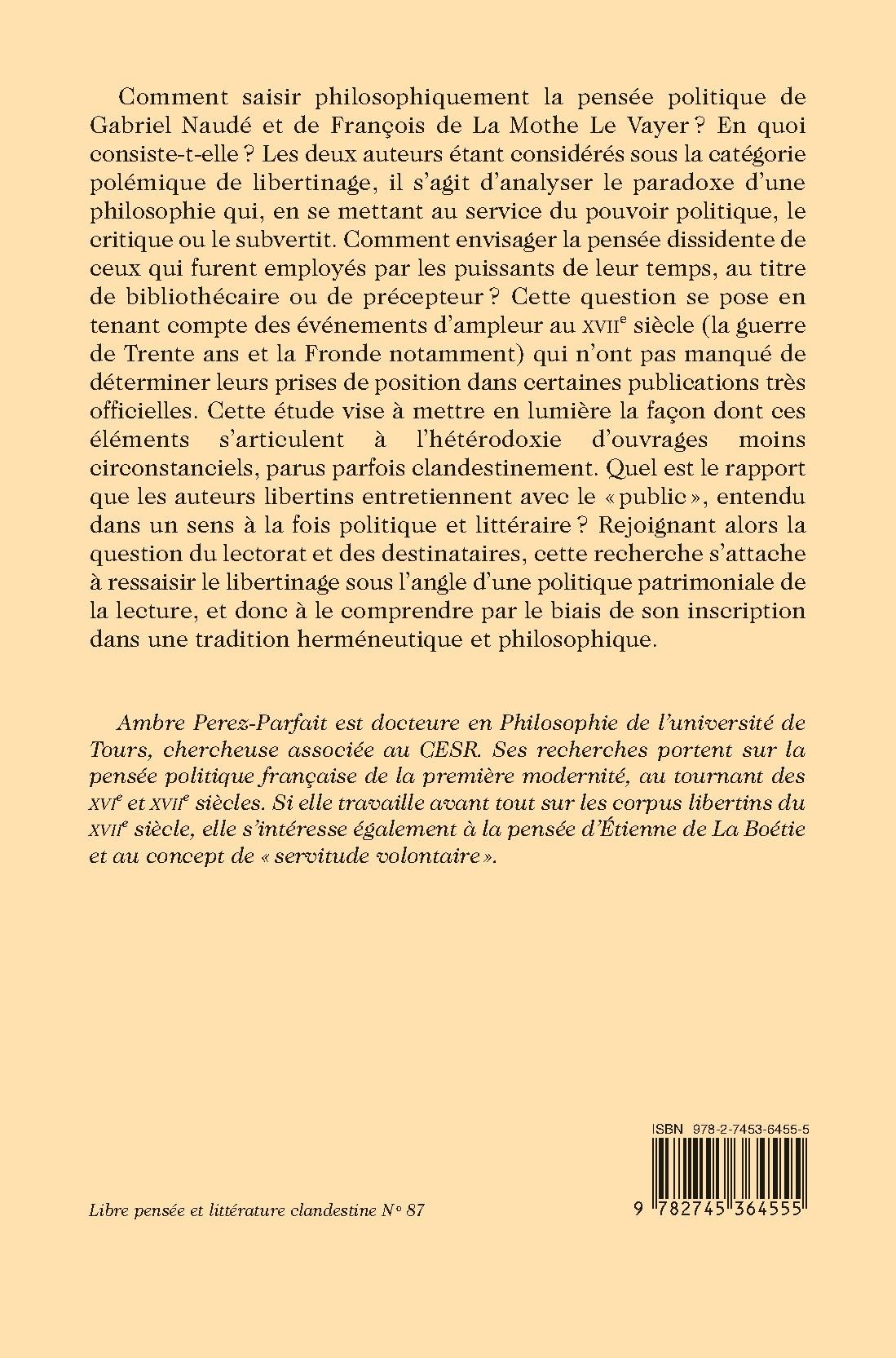 Comment saisir philosophiquement la pensée politique de Gabriel Naudé et de François de La Mothe Le Vayer ? En quoi consiste-t-elle? Les deux auteurs étant considérés sous la catégorie polémique de libertinage, il s’agit d’analyser le paradoxe d’une philosophie qui, en se mettant au service du pouvoir politique, le critique ou le subvertit. Comment envisager la pensée dissidente de ceux qui furent employés par les puissants de leur temps, au titre de bibliothécaire ou de précepteur ? Cette question se pose en tenant compte des événements d’ampleur au XVIIe siècle (la guerre de Trente ans et la Fronde notamment) qui n’ont pas manqué de déterminer leurs prises de position dans certaines publications très officielles. Cette étude vise à mettre en lumière la façon dont ces éléments s’articulent à l’hétérodoxie d’ouvrages moins circonstanciels, parus parfois clandestinement. Quel est le rapport que les auteurs libertins entretiennent avec le « public », entendu dans un sens à la fois politique et littéraire ? Rejoignant alors la question du lectorat et des destinataires, cette recherche s’attache à ressaisir le libertinage sous l’angle d’une politique patrimoniale de la lecture, et donc à le comprendre par le biais de son inscription dans une tradition herméneutique et philosophique.