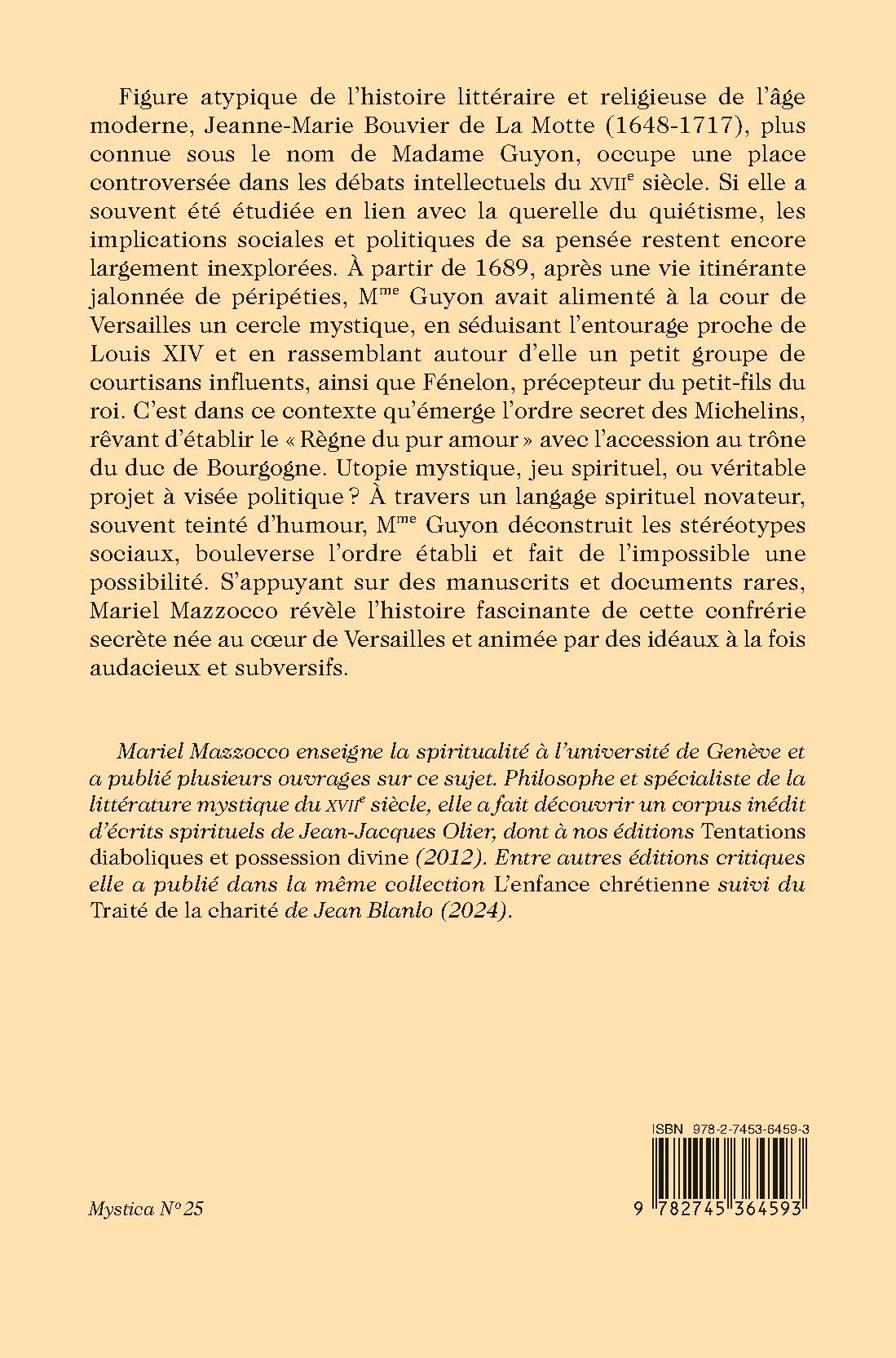 Figure atypique de l’histoire littéraire et religieuse de l’âge moderne, Jeanne-Marie Bouvier de La Motte (1648-1717), plus connue sous le nom de Madame Guyon, occupe une place controversée dans les débats intellectuels du XVIIe siècle. Si elle a souvent été étudiée en lien avec la querelle du quiétisme, les implications sociales et politiques de sa pensée restent encore largement inexplorées. À partir de 1689, après une vie itinérante jalonnée de péripéties, Mme Guyon avait alimenté à la cour de Versailles un cercle mystique, en séduisant l’entourage proche de Louis XIV et en rassemblant autour d’elle un petit groupe de courtisans influents, ainsi que Fénelon, précepteur du petit-fils du roi. C’est dans ce contexte qu’émerge l’ordre secret des Michelins, rêvant d’établir le « Règne du pur amour » avec l’accession au trône du duc de Bourgogne. Utopie mystique, jeu spirituel, ou véritable projet à visée politique ? À travers un langage spirituel novateur, souvent teinté d’humour, Mme Guyon déconstruit les stéréotypes sociaux, bouleverse l’ordre établi et fait de l’impossible une possibilité. S’appuyant sur des manuscrits et documents rares, Mariel Mazzocco révèle l’histoire fascinante de cette confrérie secrète née au coeur de Versailles et animée par des idéaux à la fois audacieux et subversifs.