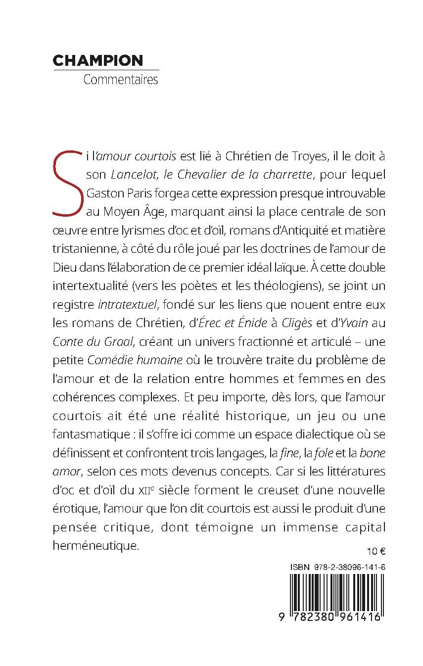Si l’amour courtois est lié à Chrétien de Troyes, il le doit à son Lancelot, le Chevalier de la charrette, pour lequel Gaston Paris forgea cette expression presque introuvable au Moyen Âge, marquant ainsi la place centrale de son œuvre entre lyrismes d’oc et d’oïl, romans d’Antiquité et matière tristanienne, à côté du rôle joué par les doctrines de l’amour de Dieu dans l’élaboration de ce premier idéal laïque. À cette double intertextualité (vers les poètes et les théologiens), se joint un registre intratextuel, fondé sur les liens que nouent entre eux les romans de Chrétien, d’Érec et Énide à Cligès et d’Yvain au Conte du Graal, créant un univers fractionné et articulé – une petite Comédie humaine où le trouvère traite du problème de l’amour et de la relation entre hommes et femmes en des cohérences complexes. Et peu importe, dès lors, que l’amour courtois ait été une réalité historique, un jeu ou une fantasmatique : il s’offre ici comme un espace dialectique où se définissent et confrontent trois langages, la fine, la fole et la bone amor, selon ces mots devenus concepts. Car si les littératures d’oc et d’oïl du XIIe siècle forment le creuset d’une nouvelle érotique, l’amour que l’on dit courtois est aussi le produit d’une pensée critique, dont témoigne un immense capital herméneutique.