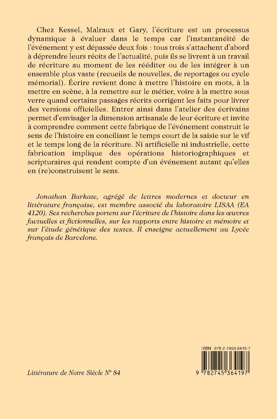 Jonathan Barkate, agrégé de lettres modernes et docteur en littérature française, est membre associé du laboratoire LISAA (EA 4120). Ses recherches portent sur l’écriture de l’histoire dans les œuvres factuelles et fictionnelles, sur les rapports entre histoire et mémoire et sur l’étude génétique des textes. Il enseigne actuellement au Lycée français de Barcelone.