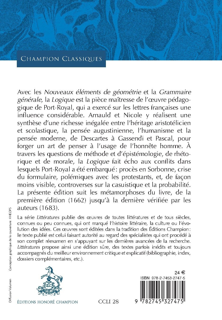 Avec les Nouveaux éléments de géométrie et la Grammaire générale, la Logique est la pièce maîtresse de l’œuvre pédagogique de Port-Royal, qui a exercé sur les lettres françaises une influence considérable. Arnauld et Nicole y réalisent une synthèse d’une richesse inégalée entre l’héritage aristotélicien et scolastique, la pensée augustinienne, l’humanisme et la pensée moderne, de Descartes à Gassendi et Pascal, pour forger un art de penser à l’usage de l’honnête homme. À travers les questions de méthode et d’épistémologie, de rhétorique et de morale, la Logique fait écho aux conflits dans lesquels Port-Royal a été embarqué : procès en Sorbonne, crise du formulaire, polémiques avec les protestants, et, de façon moins visible, controverses sur la casuistique et la probabilité. La présente édition suit les métamorphoses du livre, de la première édition (1662) jusqu’à la dernière vérifiée par les auteurs (1683).