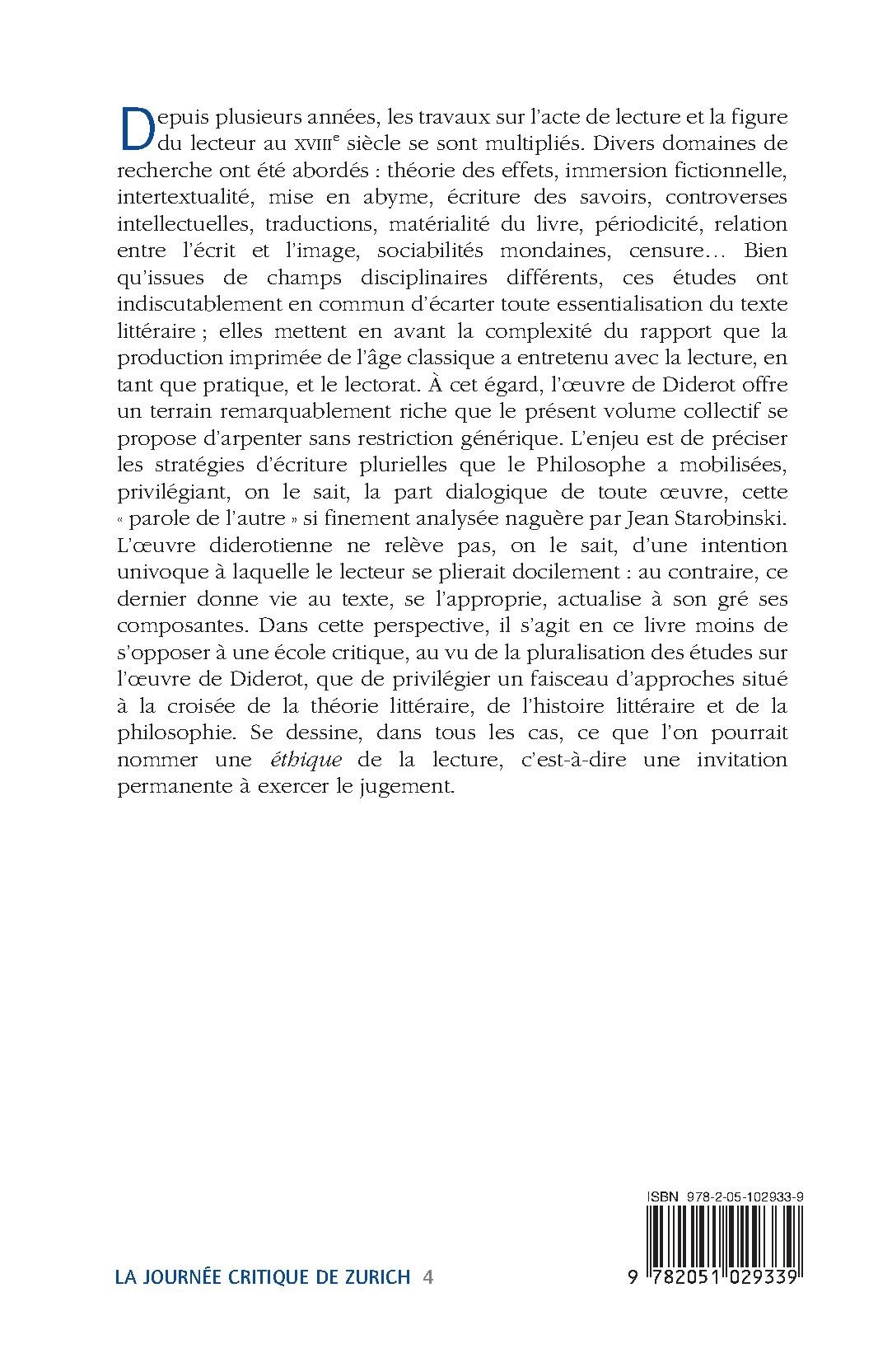 Depuis plusieurs années, les travaux sur l’acte de lecture et la figure du lecteur au XVIIIe siècle se sont multipliés. Divers domaines de recherche ont été abordés : théorie des effets, immersion fictionnelle, intertextualité, mise en abyme, écriture des savoirs, controverses intellectuelles, traductions, matérialité du livre, périodicité, relation entre l’écrit et l’image, sociabilités mondaines, censure… Bien qu’issues de champs disciplinaires différents, ces études ont indiscutablement en commun d’écarter toute essentialisation du texte littéraire ; elles mettent en avant la complexité du rapport que la production imprimée de l’âge classique a entretenu avec la lecture, en tant que pratique, et le lectorat. À cet égard, l’oeuvre de Diderot offre un terrain remarquablement riche que le présent volume collectif se propose d’arpenter sans restriction générique. L’enjeu est de préciser les stratégies d’écriture plurielles que le Philosophe a mobilisées, privilégiant, on le sait, la part dialogique de toute oeuvre, cette « parole de l’autre » si finement analysée naguère par Jean Starobinski.