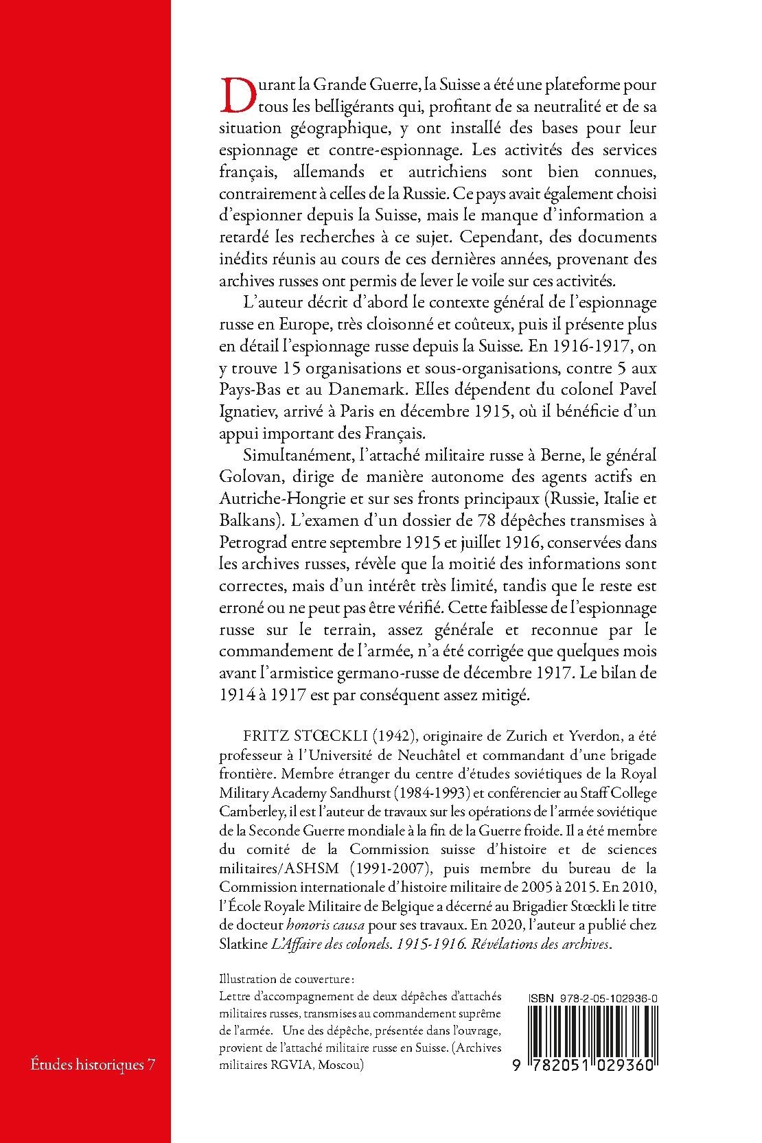 Durant la Grande Guerre, la Suisse a été une plateforme pour tous les belligérants qui, profitant de sa neutralité et de sa situation géographique, y ont installé des bases pour leur espionnage et contre-espionnage. Les activités des services français, allemands et autrichiens sont bien connues, contrairement à celles de la Russie. Ce pays avait également choisi d’espionner depuis la Suisse, mais le manque d’information a retardé les recherches à ce sujet. Cependant, des documents inédits réunis au cours de ces dernières années, provenant des archives russes ont permis de lever le voile sur ces activités.